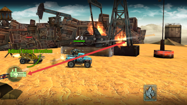 3、戰(zhàn)斗過程中,點擊左側(cè)武器方向調(diào)整按鈕,旋轉(zhuǎn)武器攻擊角度,精準(zhǔn)打擊敵方載具,推進戰(zhàn)斗進程。