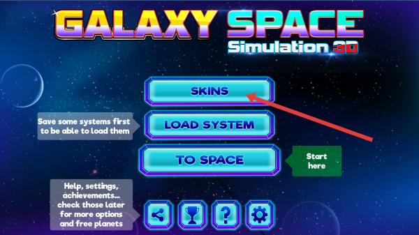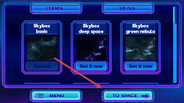 1、點(diǎn)擊主界面上方的SKINS按鈕,進(jìn)入皮膚選擇界面,可查看Skybox-deep-space等不同星空背景皮膚,為太空探索定制視覺風(fēng)格。