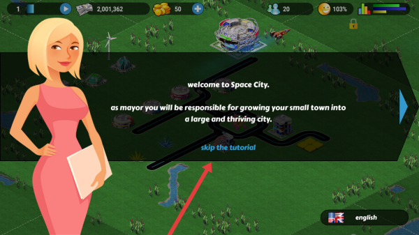 1、在Space-City初始界面,點(diǎn)擊skip-the-tutorial,直接進(jìn)入城市建設(shè)主界面,開啟城鎮(zhèn)發(fā)展規(guī)劃。