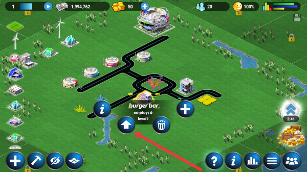 2、主界面中點(diǎn)擊Burger-bar旁的向上箭頭按鈕,查看該建筑的雇傭、收入等詳細(xì)信息。