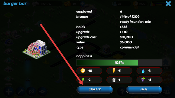 3、進(jìn)入Burger-bar詳情頁,點(diǎn)擊藍(lán)色UPGRADE按鈕,消耗10200金幣升級該商業(yè)建筑,提升收益。
