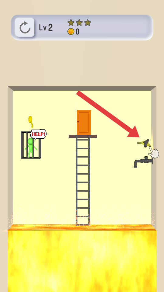 3、進(jìn)入Lv2先拾取右側(cè)扳手,打開水龍頭熄滅地面的火焰,再獲取籠子上方鑰匙救出小人,最終通過梯子前往橙色門。