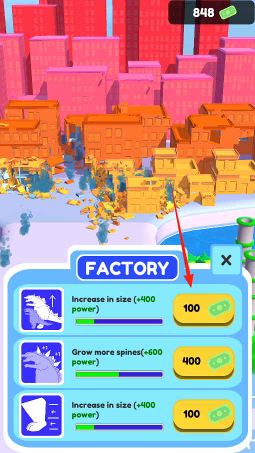 3、賺到錢后會彈出FACTORY界面,里面有不同的強化選項,你可以用賺到的錢,選擇合適的選項來強化怪獸,讓它變得更厲害。