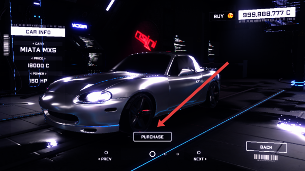 1、在車(chē)輛購(gòu)買(mǎi)界面點(diǎn)擊PURCHASE按鈕,花費(fèi)18000C購(gòu)入MIATA-MX5,解鎖該車(chē)型用于游戲。