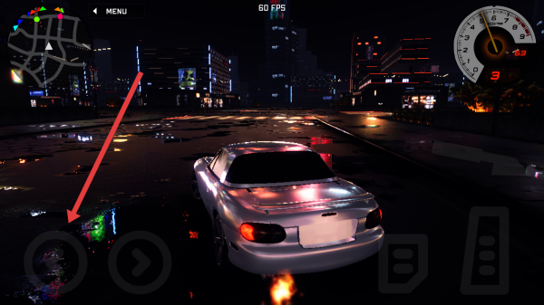 3、駕駛階段操控左側(cè)虛擬搖桿控制汽車(chē)方向,在城市夜景道路行駛,借助地圖與儀表盤(pán)把控車(chē)況。