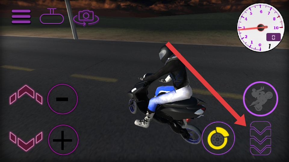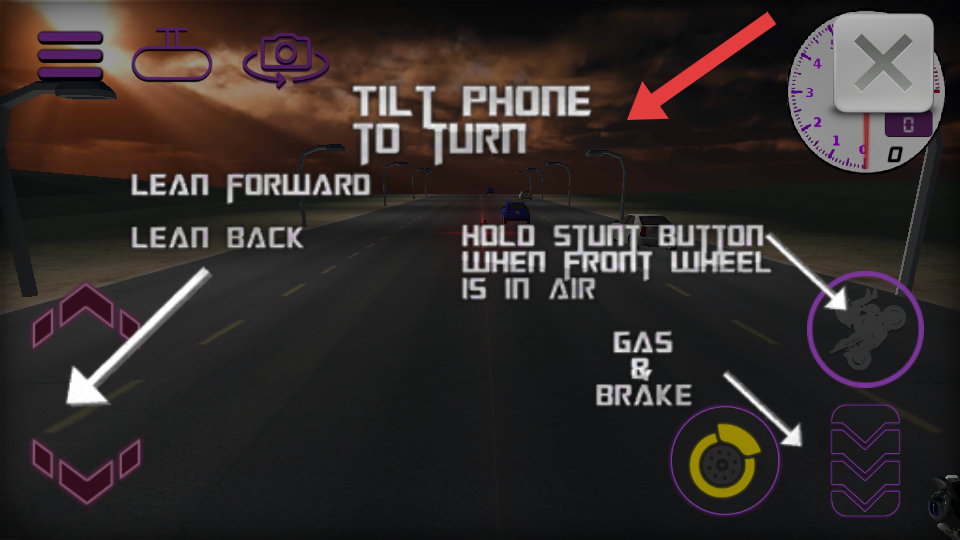 1、按TILT PHONE TO TURN提示傾斜手機(jī)轉(zhuǎn)向,通過前傾/后仰調(diào)整車身,前輪騰空時(shí)按住右側(cè)特技鍵,右側(cè)圓形按鍵控制油門與剎車。