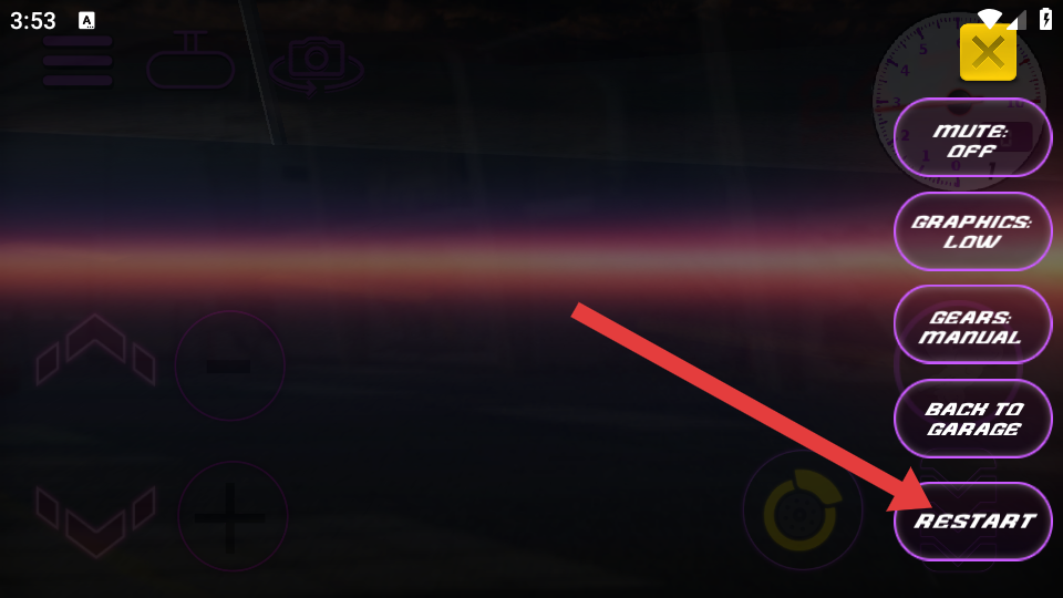 3、進(jìn)入游戲菜單,可以設(shè)置mute靜音、GRAPHICS:LOW畫質(zhì)、GEARS:MANUAL擋位,也能選擇返回車庫或重啟關(guān)卡。