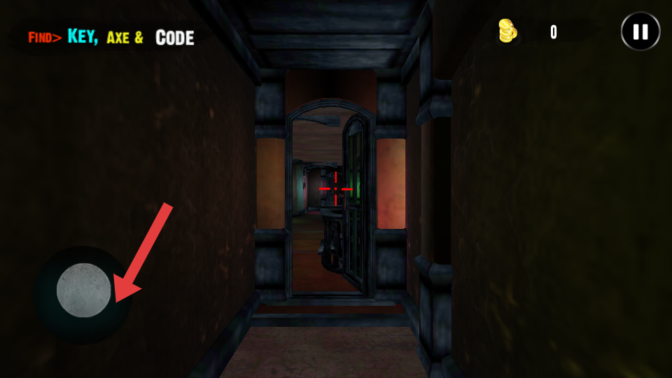 1、進入昏暗走廊,用左側(cè)的搖桿移動,依據(jù)頂部的提示,沿箭頭的方向繼續(xù)探索房間,留意門與通道。