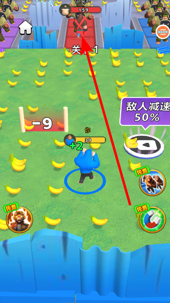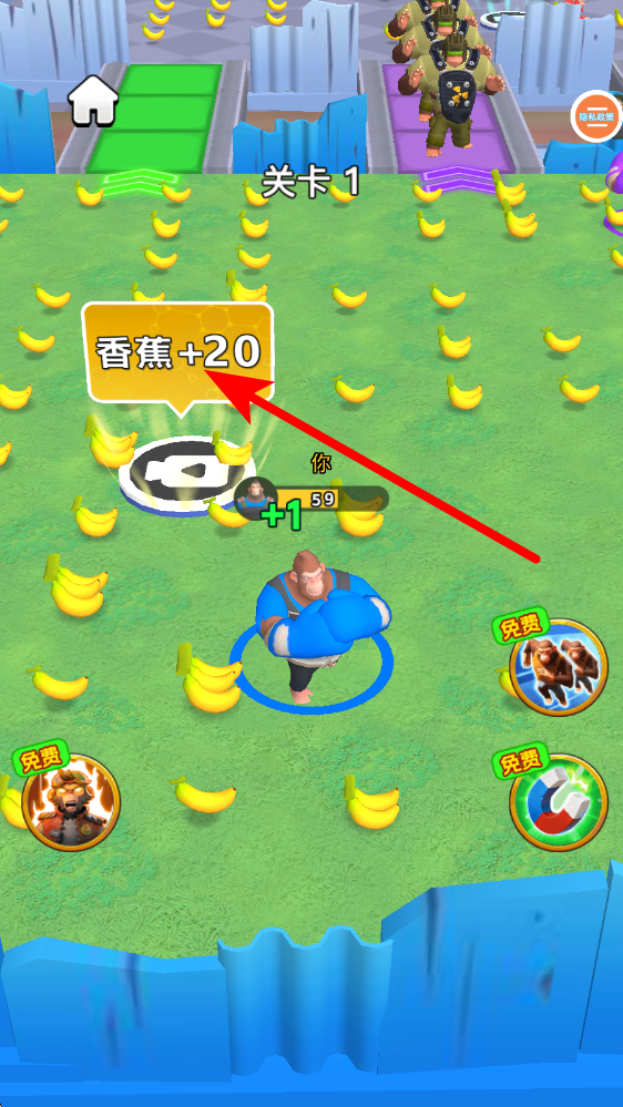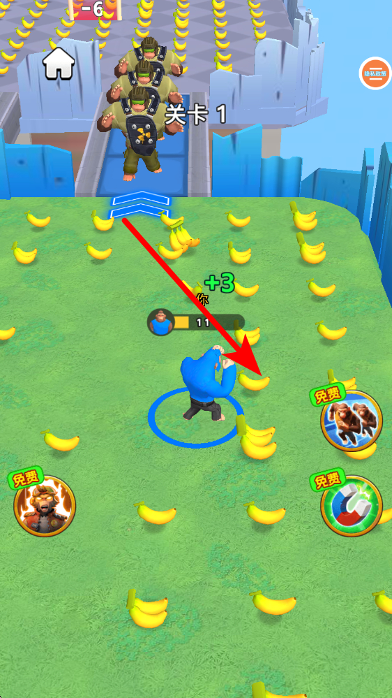 1、進(jìn)入關(guān)卡場景后,精準(zhǔn)操控角色靈活移動,優(yōu)先拾取地面散落香蕉,持續(xù)積累數(shù)量以提升角色屬性,同時留意免費(fèi)技能道具位置,為即將應(yīng)對的敵人做好準(zhǔn)備。
