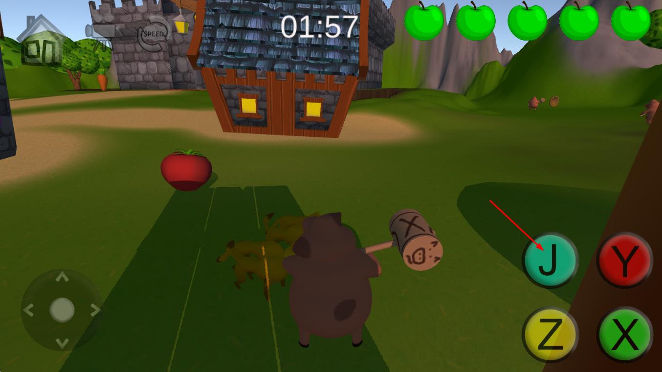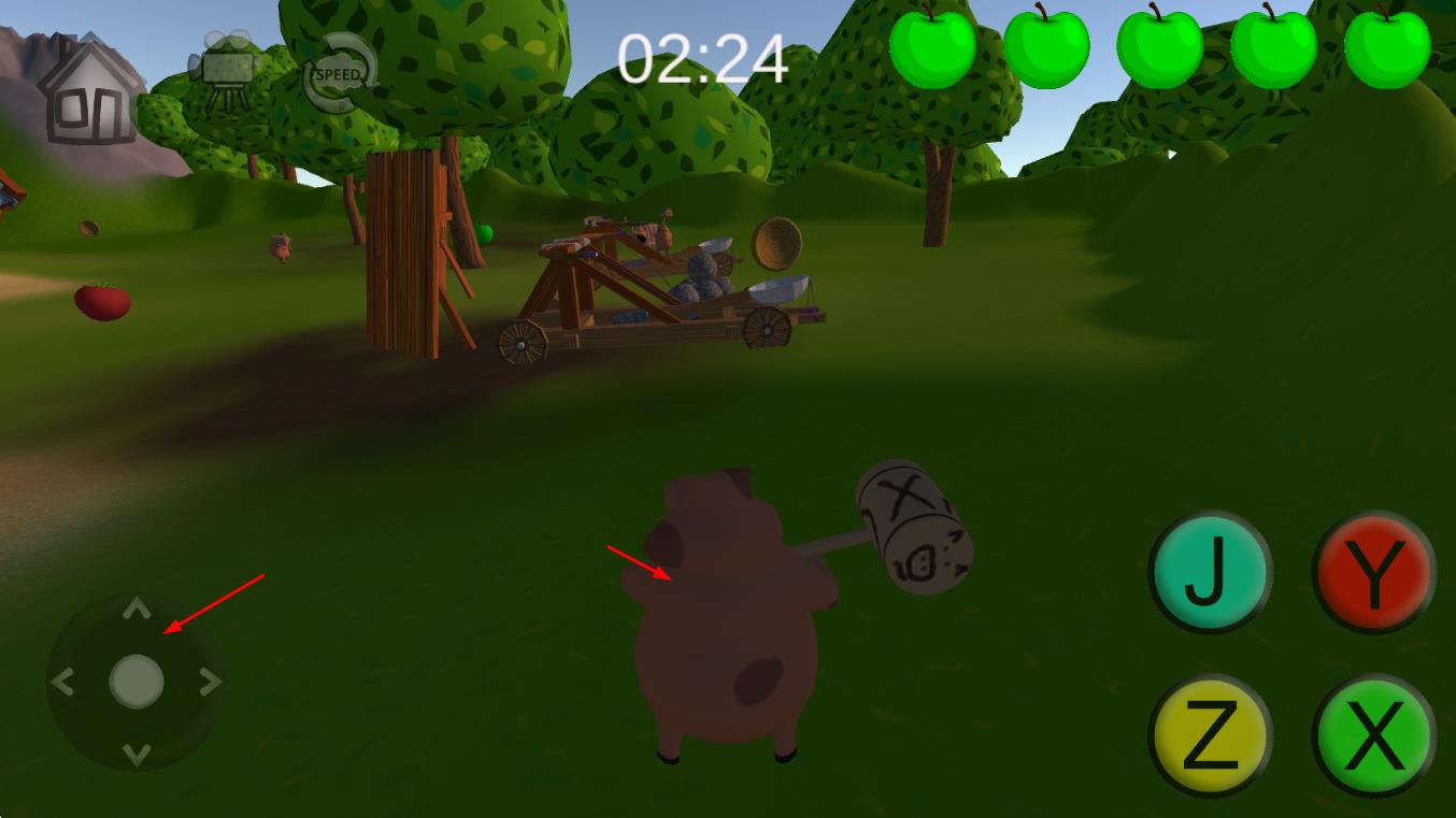 1、進(jìn)入游戲后選擇小豬角色與初始武器,在戰(zhàn)場中通過虛擬搖桿控制移動,點(diǎn)擊攻擊按鈕使用武器對戰(zhàn)敵人。