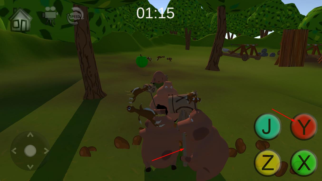 1、角色移動戰(zhàn)斗:通過虛擬搖桿控制小豬在戰(zhàn)場中靈活走位,避開敵方攻擊的同時,點(diǎn)擊攻擊按鈕使用武器瞄準(zhǔn)射擊,擊敗迎面而來的敵人。