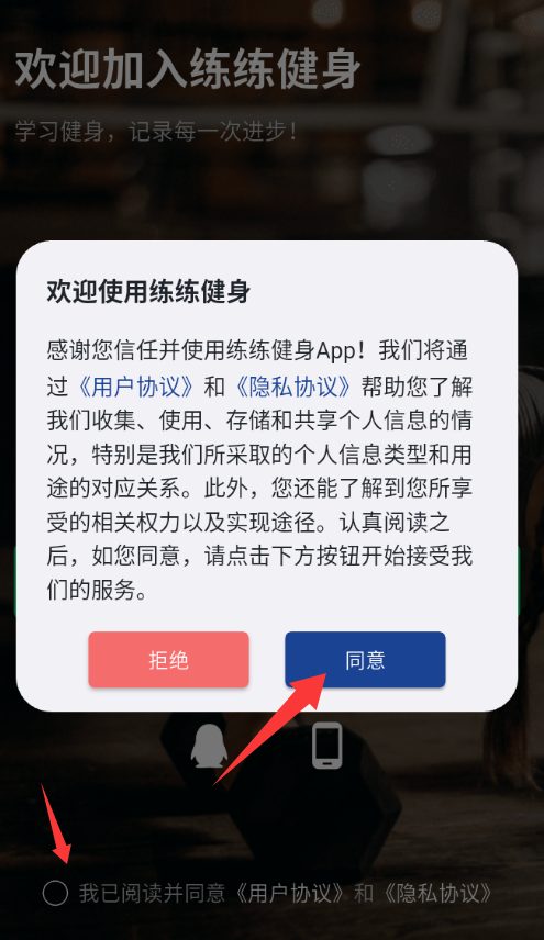1、點(diǎn)擊歡迎使用練練健身里的同意并進(jìn)入。