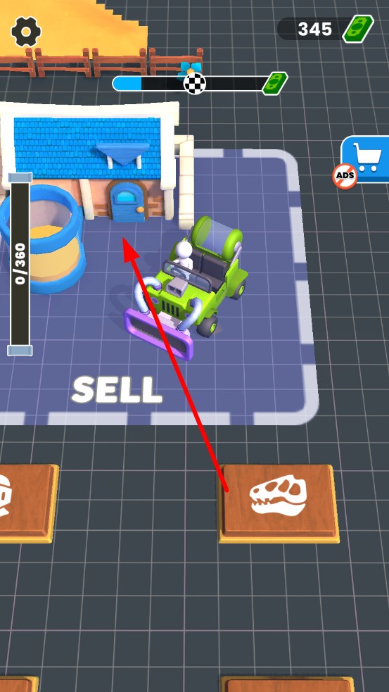 2、進度條拉滿后,返回基地,點擊SELL出售收集的沙石,積攢金幣,用于升級更多的屬性。