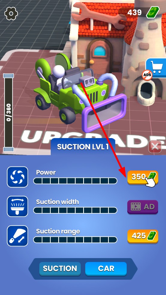3、在升級界面消耗金幣強化吸附功率、寬度與范圍,或解鎖新車型,如帶雙吸附口的工程車。