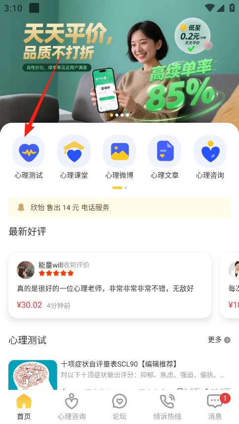 1、首頁(yè)有心理測(cè)試功能,點(diǎn)進(jìn)去能做各種心理測(cè)試,同時(shí)首頁(yè)還有心理課堂,心理微博等其他心理相關(guān)功能,能滿足不同的心理需求,而且還有用戶好評(píng)展示,能參考別人的體驗(yàn)。