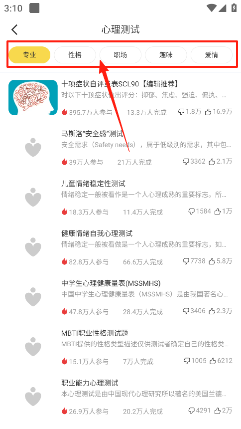2、進(jìn)入心理測(cè)試板塊后,能看到專業(yè)性格職場(chǎng)等不同分類的測(cè)試,每個(gè)分類下有很多測(cè)試項(xiàng)目,像十項(xiàng)癥狀自評(píng)量表這些,你可以根據(jù)自己的需求選擇想做的測(cè)試。