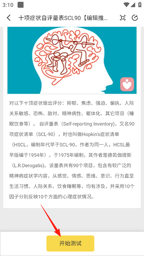 3、選好具體的心理測(cè)試,比如十項(xiàng)癥狀自評(píng)量表后,能看到詳細(xì)的測(cè)試介紹,了解清楚后,點(diǎn)開始測(cè)試按鈕,就可以進(jìn)行測(cè)試,看看自己在抑郁焦慮等方面的情況啦。
