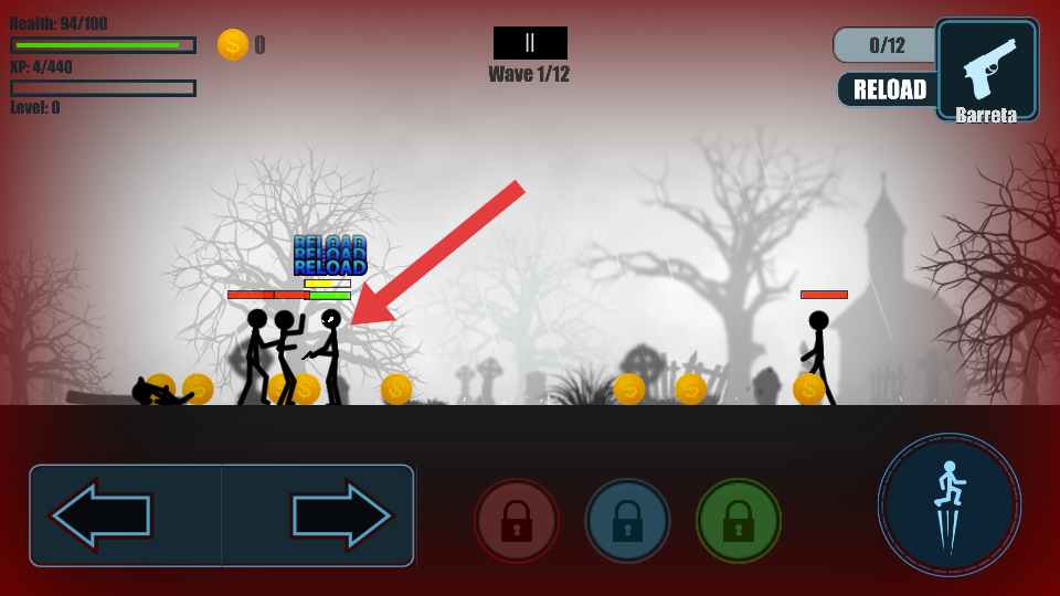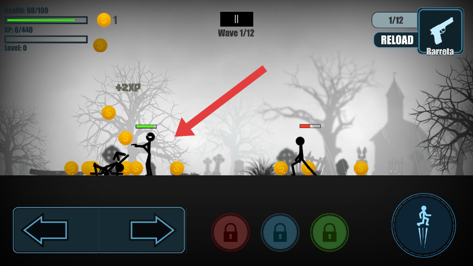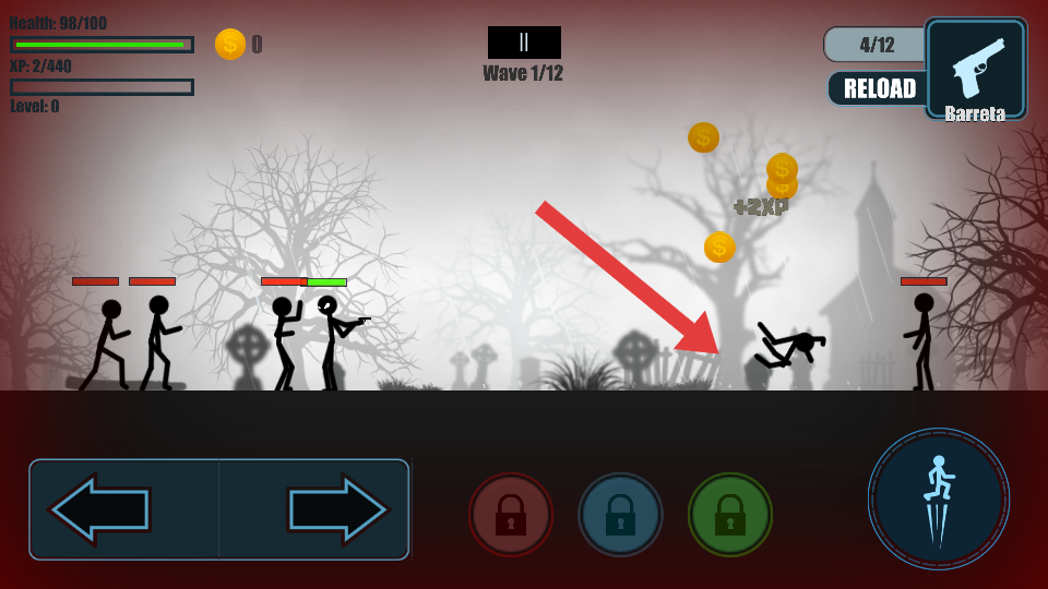 1、進入墓地場景,操控火柴人進行左右移動箭頭鍵,瞄準(zhǔn)敵方火柴人,點擊射擊鍵進行攻擊。
