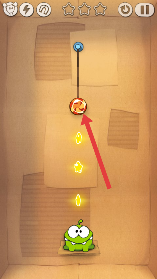 1、觀察到糖果懸掛與星星位置,找準(zhǔn)一定的時(shí)機(jī),適時(shí)點(diǎn)擊繩子的藍(lán)色圓點(diǎn)處割斷,讓糖果下落。