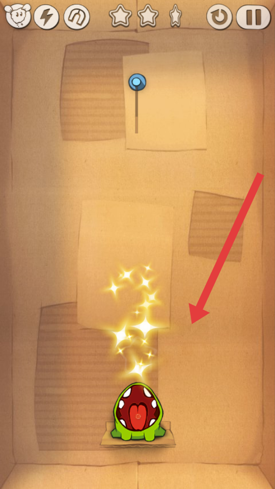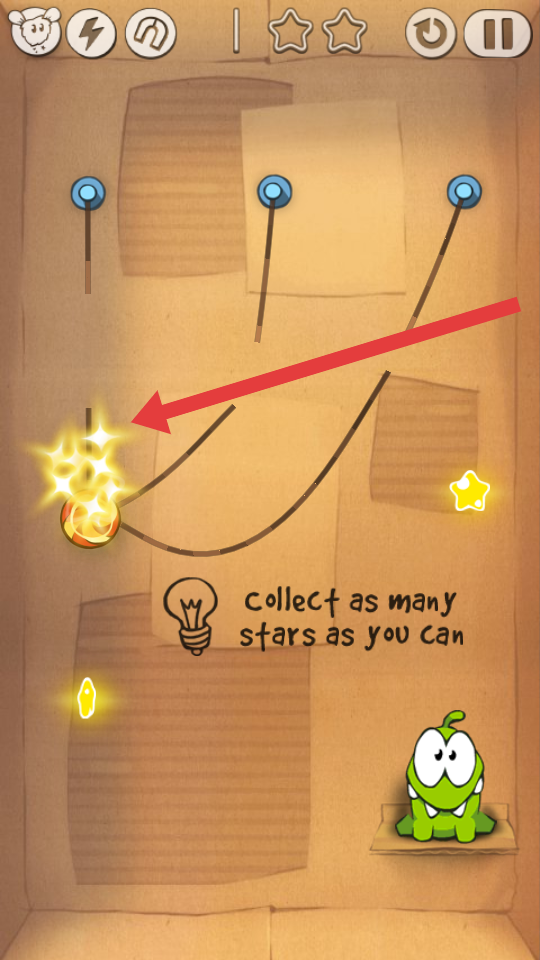 2、確保糖果的路徑經(jīng)過(guò)部分的星星,落入了青蛙口中,優(yōu)先收集全部的星星,提升關(guān)卡的評(píng)分。