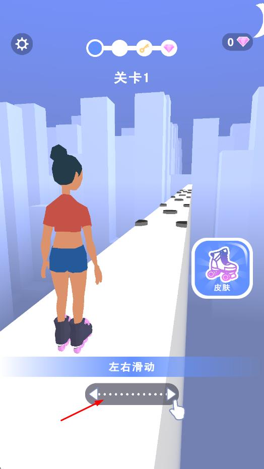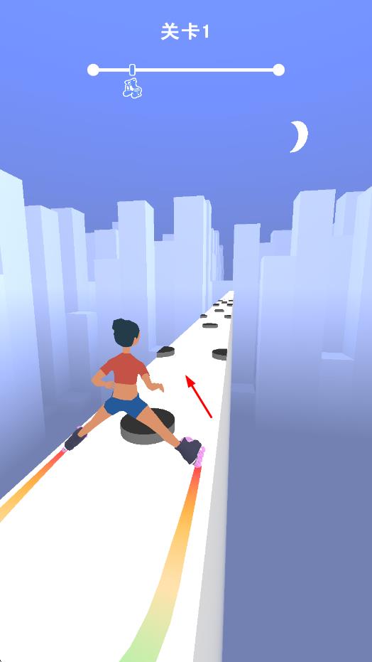 1、進(jìn)入游戲選擇初始關(guān)卡,滑動(dòng)屏幕控制角色左右轉(zhuǎn)向,點(diǎn)擊屏幕觸發(fā)跳躍,避開路面障礙物開啟輪滑跑酷。