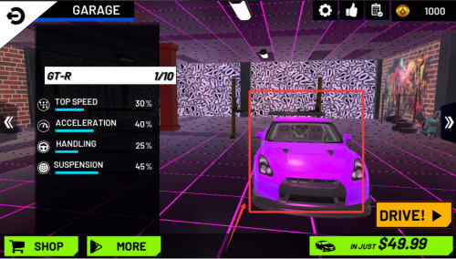 2、從車庫挑選心儀跑車,每款車型擁有獨(dú)特的特技性能與操控手感。