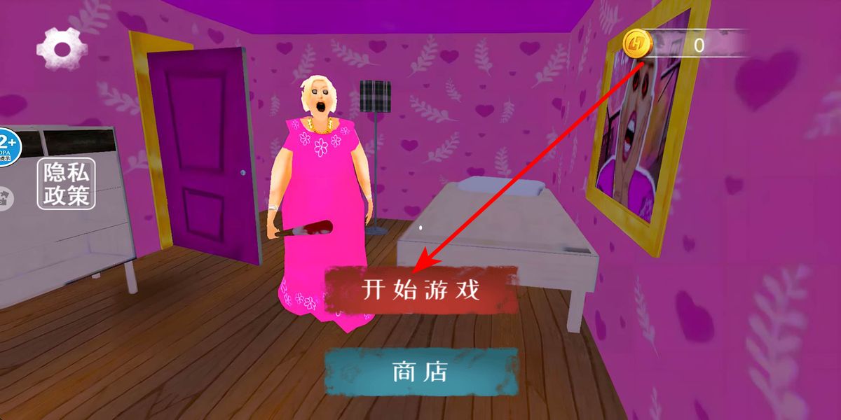 1、進(jìn)入游戲,點擊開始游戲,在粉紫色初始房間停留,快速掃視家具、物品分布,記住關(guān)鍵位置,為后續(xù)躲避與探索筑牢基礎(chǔ)。