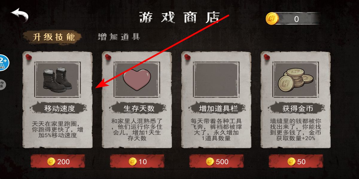 2、點擊商店,優(yōu)先用金幣升級移動速度,提升移速方便靈活躲避老奶,后續(xù)按需選生存天數(shù)等技能升級,逐步強化生存的能力。