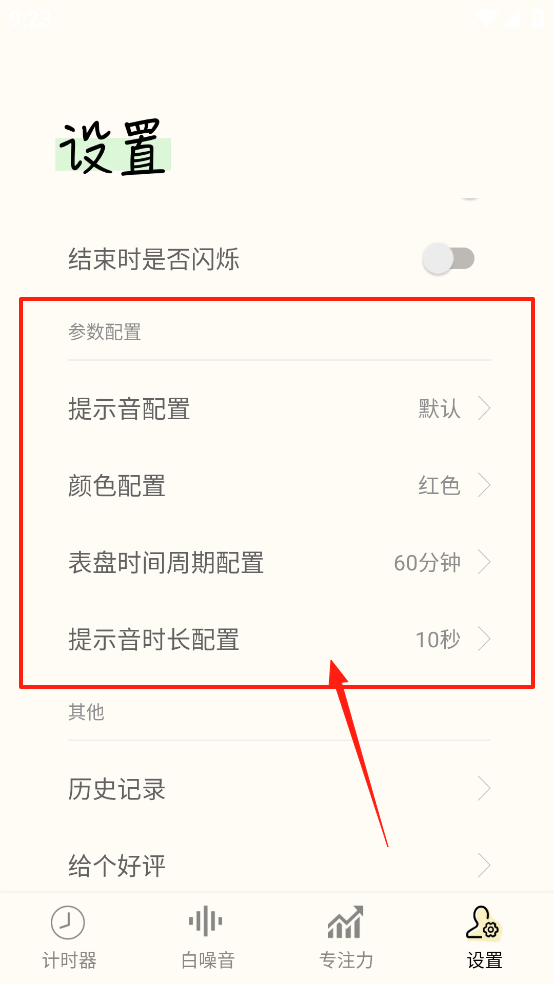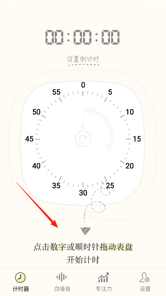 1、基礎(chǔ)設(shè)置操作:進(jìn)入軟件后,可根據(jù)需求自定義提示音、表盤顏色和白噪音模式,選擇適合自己的設(shè)置組合,讓計(jì)時(shí)器以個(gè)性化狀態(tài)運(yùn)行,提供舒適的環(huán)境。