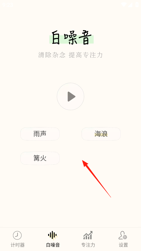 2、此為白噪音功能界面,這里提供了雨聲,海浪,篝火等多種白噪音選項(xiàng),用戶可自由挑選,播放白噪音能夠幫助清除雜念,有效提高專注力,適合在需要靜心專注的時(shí)刻使用。
