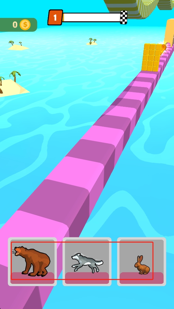 1、進(jìn)入作品后,從熊、狼、兔子中選擇合適動(dòng)物,操控其在粉色方格鋪成的路徑上前進(jìn),注意避開障礙,收集金幣。