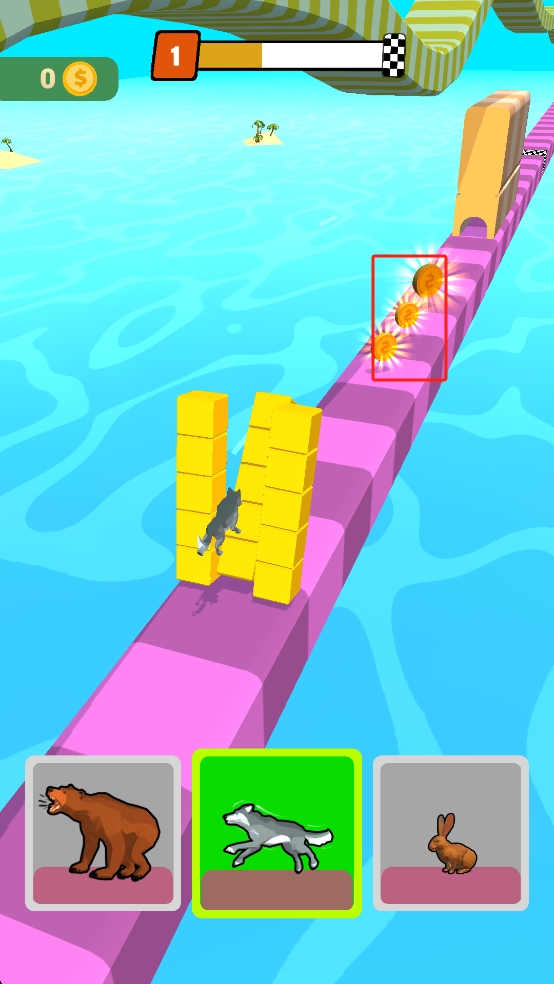 2、選擇狼后,操控它穿過黃色方塊組成的通道,同時(shí)盡可能多地收集路徑上的金幣,保持移動(dòng)速度和方向,順利通過關(guān)卡。