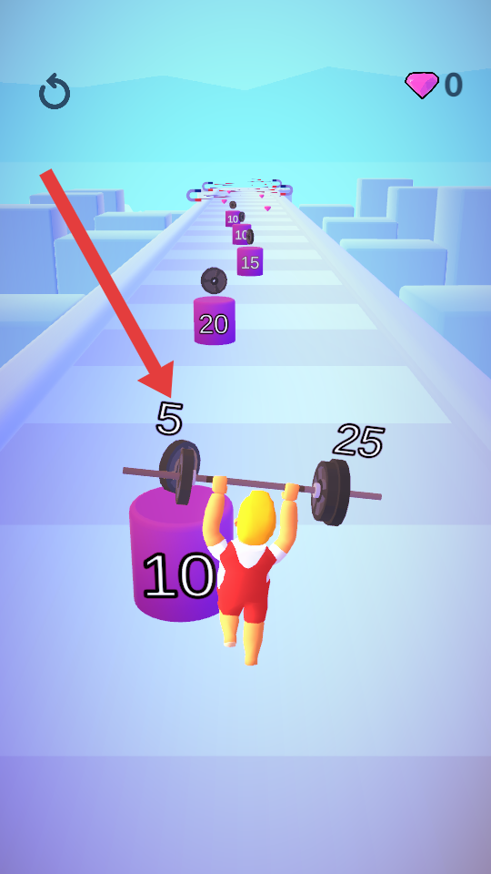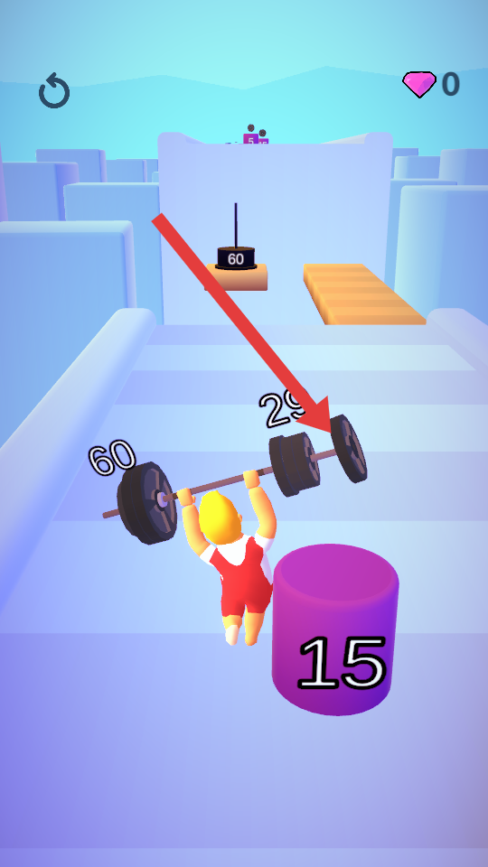 2、遇分岔路選圓柱密集側(cè),連續(xù)撞擊圓柱疊加重量杠鈴片加圓柱數(shù)字,提升得分,湊近黑色圓盤。