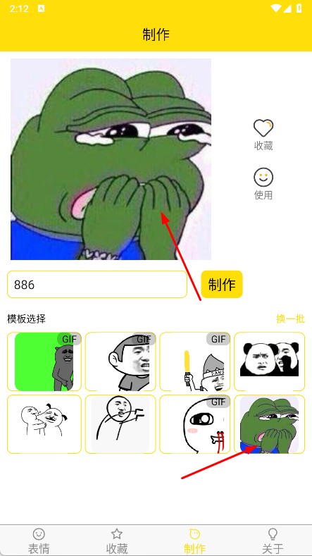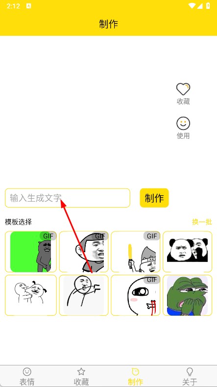 2、想自制表情包,切換到制作頁,在輸入生成文字框填入內(nèi)容,從模板選擇選心儀表情模板。