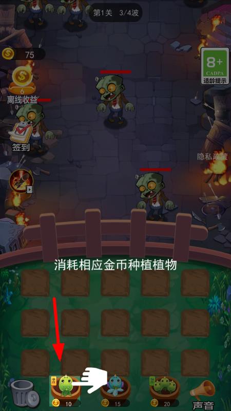 1、進(jìn)入游戲后,在初始陣地中放置基礎(chǔ)植物,通過陽光收集獲取合成資源,將相同等級的植物拖動到一起完成合成,解鎖更高等級的防御戰(zhàn)力。