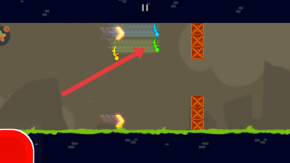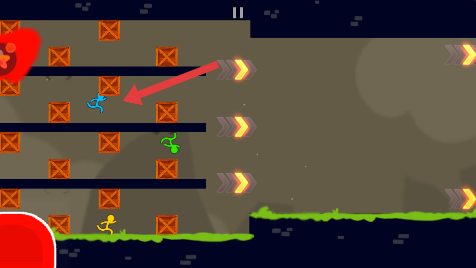 3、多火柴人同時(shí)跑時(shí),注意彼此位置,協(xié)同避障,借助地形草地、高臺(tái)的優(yōu)勢,沖刺到終點(diǎn)。