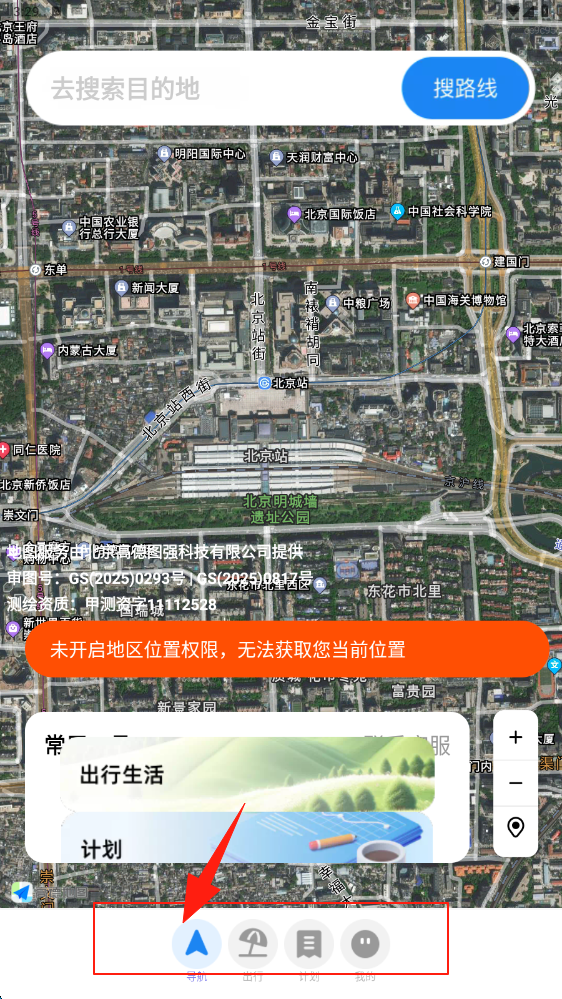 1、在地圖頁面,搜索目的地后點搜路線,若位置權(quán)限未開,開啟權(quán)限獲取當(dāng)前位置,使用底部功能按鈕。
