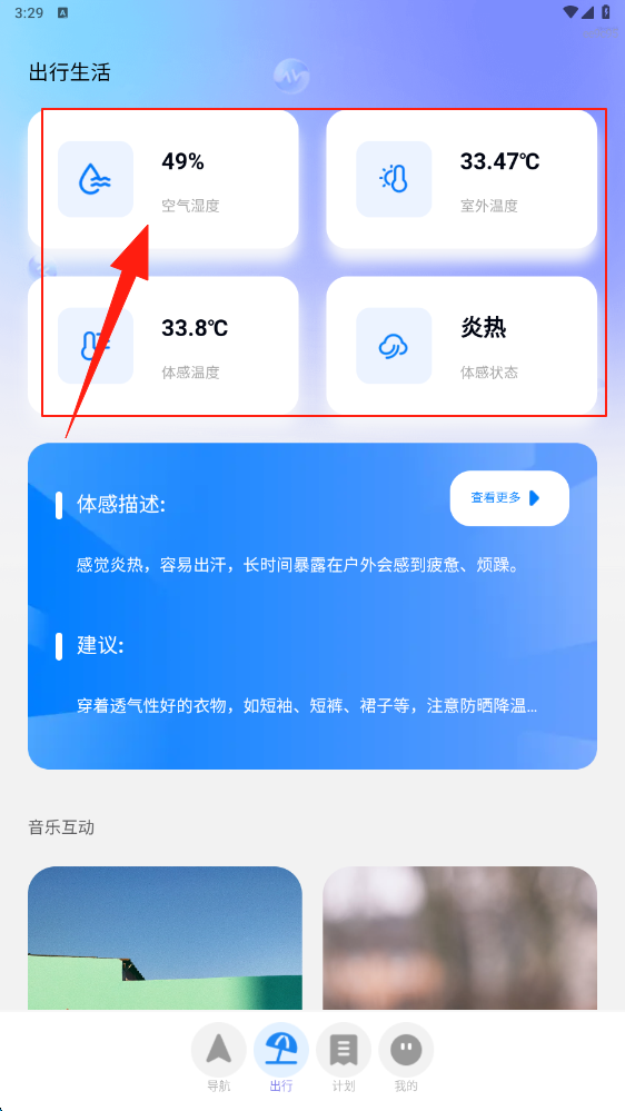 2、切換到出行頁面,查看空氣濕度、室外溫度等信息,依據(jù)體感建議規(guī)劃出行,參與音樂互動。