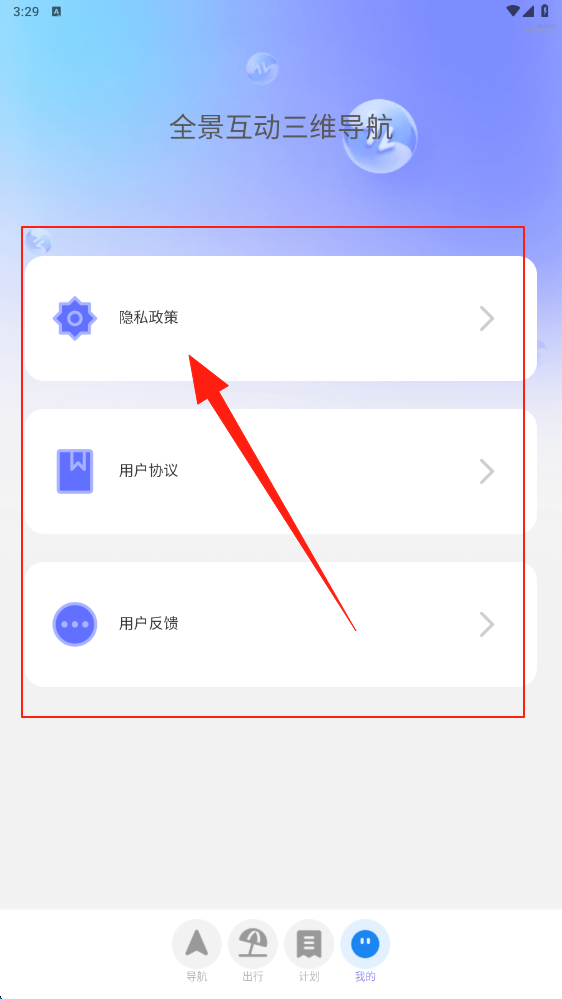 3、進(jìn)入我的頁面,查看隱私政策、用戶協(xié)議,提交反饋,管理全景互動三維導(dǎo)航相關(guān)設(shè)置。