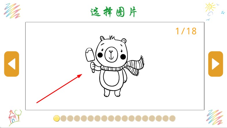 1、打開動物畫畫填色,進入選擇圖片頁,瀏覽卡通圖案,如拿冰棍的小熊,左右切換選想填色的圖。