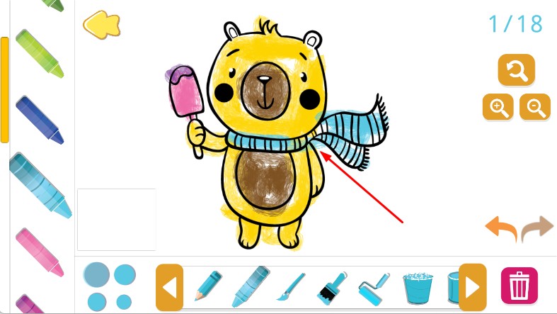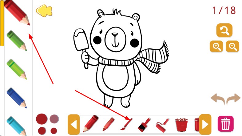 2、進入填色界面,左側選畫筆,下方選對應顏色,如紅色、棕色,在圖案區(qū)域,如小熊身體、圍巾等,點擊或涂抹上色。