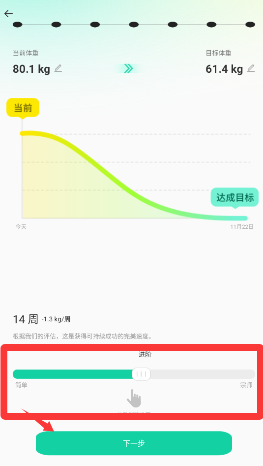 4、紅色框框哪里是可以調(diào)節(jié)多少周可以達(dá)成目標(biāo)體重。