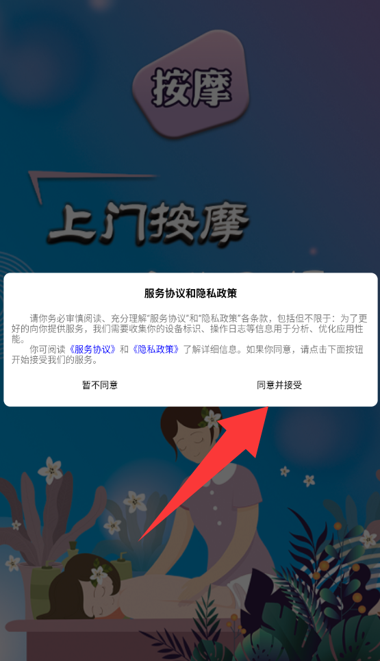 1、點擊服務協(xié)議和隱私政策里的同意并接受。