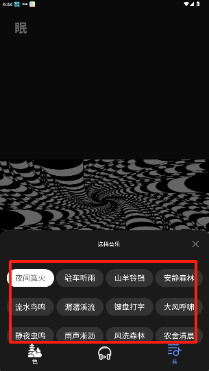 4、點(diǎn)擊下方第三個(gè)色,即可設(shè)置你要播放的助眠音樂。