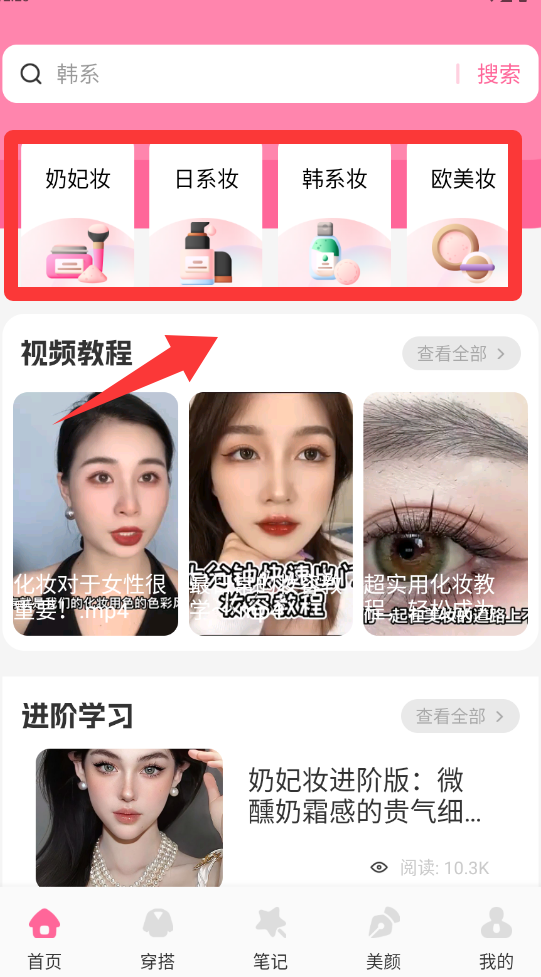 2、進入軟件頁面紅色框框哪里是教你怎么化妝的。