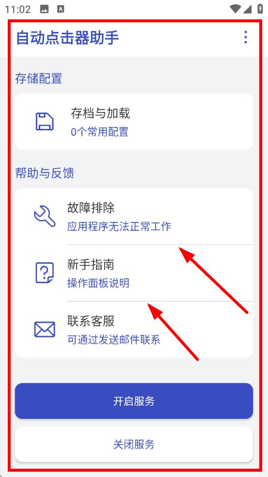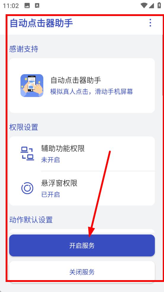 1、進(jìn)入【自動點(diǎn)擊器助手】主界面,確認(rèn)權(quán)限設(shè)置,點(diǎn)擊【開啟服務(wù)】按鈕,啟動自動點(diǎn)擊服務(wù)。