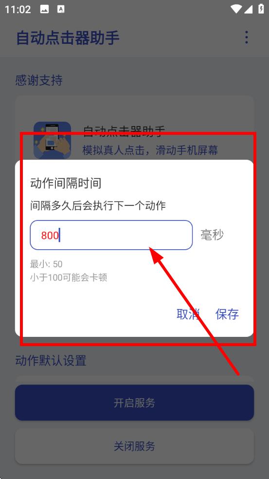 2、開啟服務(wù)后,若彈出【動作間隔時間】設(shè)置框,在輸入框填寫間隔時間,點(diǎn)擊【保存】確認(rèn)設(shè)置,調(diào)整動作執(zhí)行間隔。