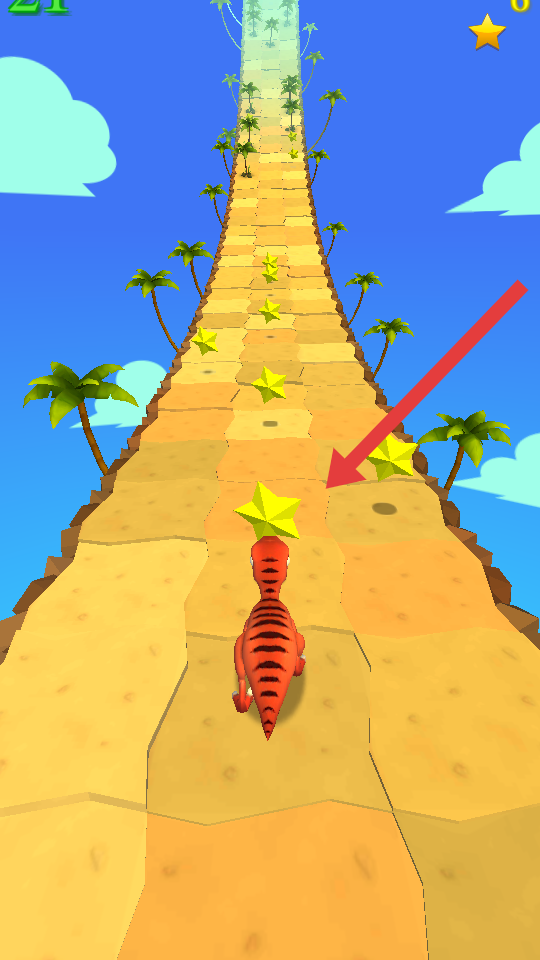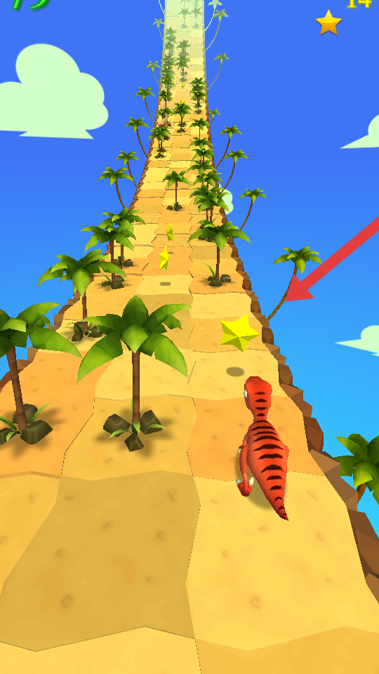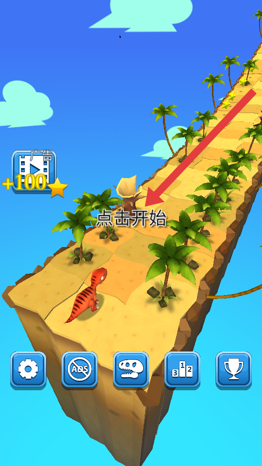 1、點擊下點擊開始的按鍵,操控恐龍沿著跑道跑,左右滑動躲棕櫚樹,優(yōu)先吃大星星加分多。