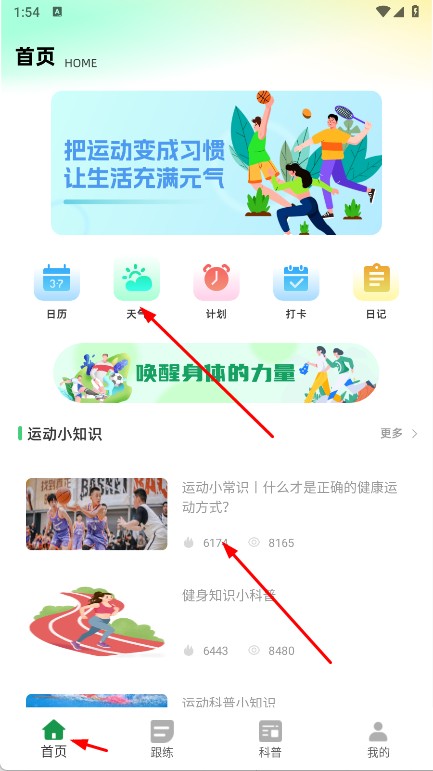 1、開啟一分鐘跳繩,進(jìn)入首頁,可利用天氣、日歷等工具,瀏覽運(yùn)動(dòng)小知識(shí)板塊,學(xué)習(xí)健康運(yùn)動(dòng)知識(shí)。