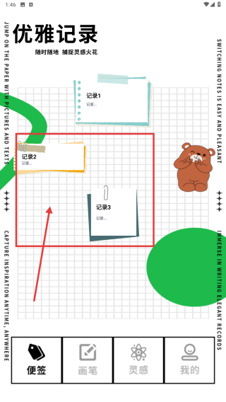 1、進(jìn)入優(yōu)雅記錄界面,點(diǎn)擊記錄2、記錄3等便簽,可查看或編輯對應(yīng)內(nèi)容,隨時捕捉靈感火花。